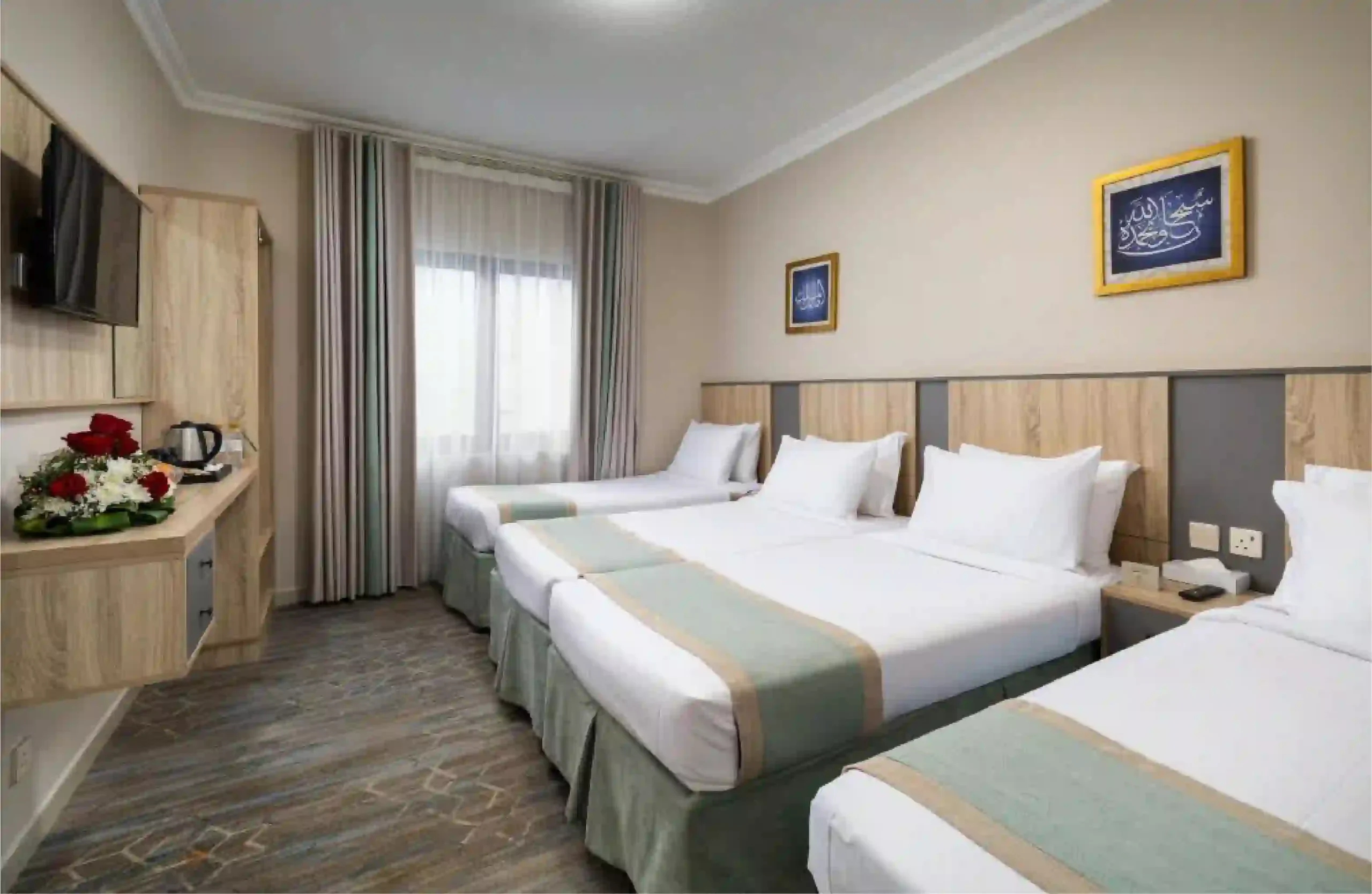 The rooms are air-conditioned and wisely furnished with the necessary facilities like a TV and electric kettle to have a comfortable stay after spending many hours in prayer. It has a 24-hour front desk manned by staff who understand both Arabic and English to help the pilgrims at any moment.